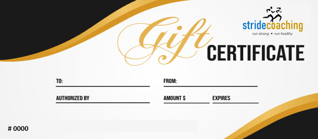 GIVE THE GIFT OF RUNNING to someone you love, or to yourself! Gift Certificates can be used toward any coaching services offered by Stride Coaching.